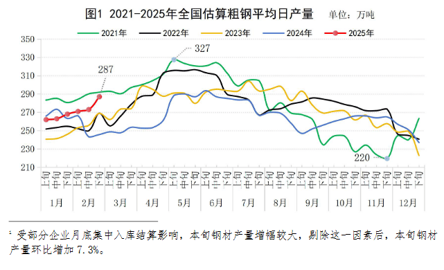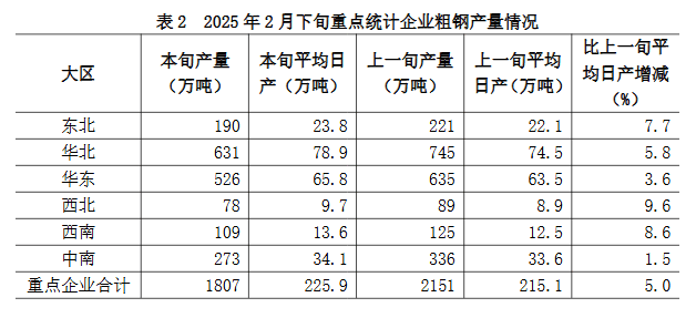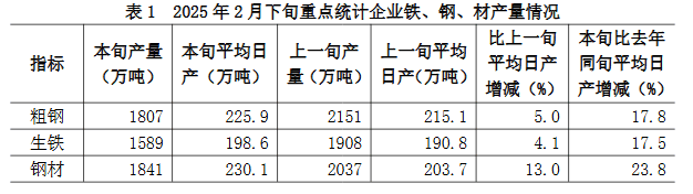 2025年2月下旬,重點(diǎn)統(tǒng)計(jì)鋼鐵企業(yè)共生產(chǎn)粗鋼1807萬噸,平均日產(chǎn)225.9萬噸,日產(chǎn)環(huán)比增長5.0%;生鐵1589萬噸,平均日產(chǎn)198.6萬噸,日產(chǎn)環(huán)比增長4.1%;鋼材1841萬噸,平均日產(chǎn)230.1萬噸,日產(chǎn)環(huán)比增長13.0%(見表1)1。