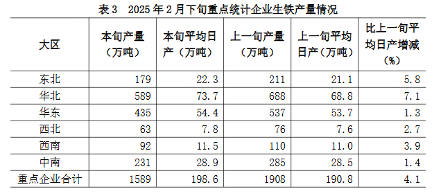 2月下旬六大地區(qū)重點(diǎn)統(tǒng)計(jì)企業(yè)生鐵日產(chǎn)量較上一旬均有不同程度增長(詳見表3),具體為: