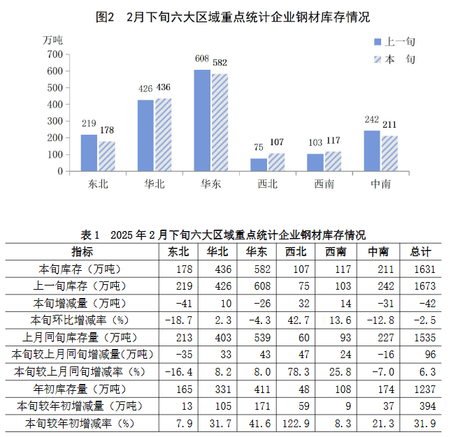 2月下旬六大地區(qū)中,華北、西北、西南地區(qū)重點(diǎn)企業(yè)鋼材庫(kù)存較上一旬有不同程度增長(zhǎng),其它地區(qū)均有不同程度下降(見(jiàn)圖2、表1),具體情況為: